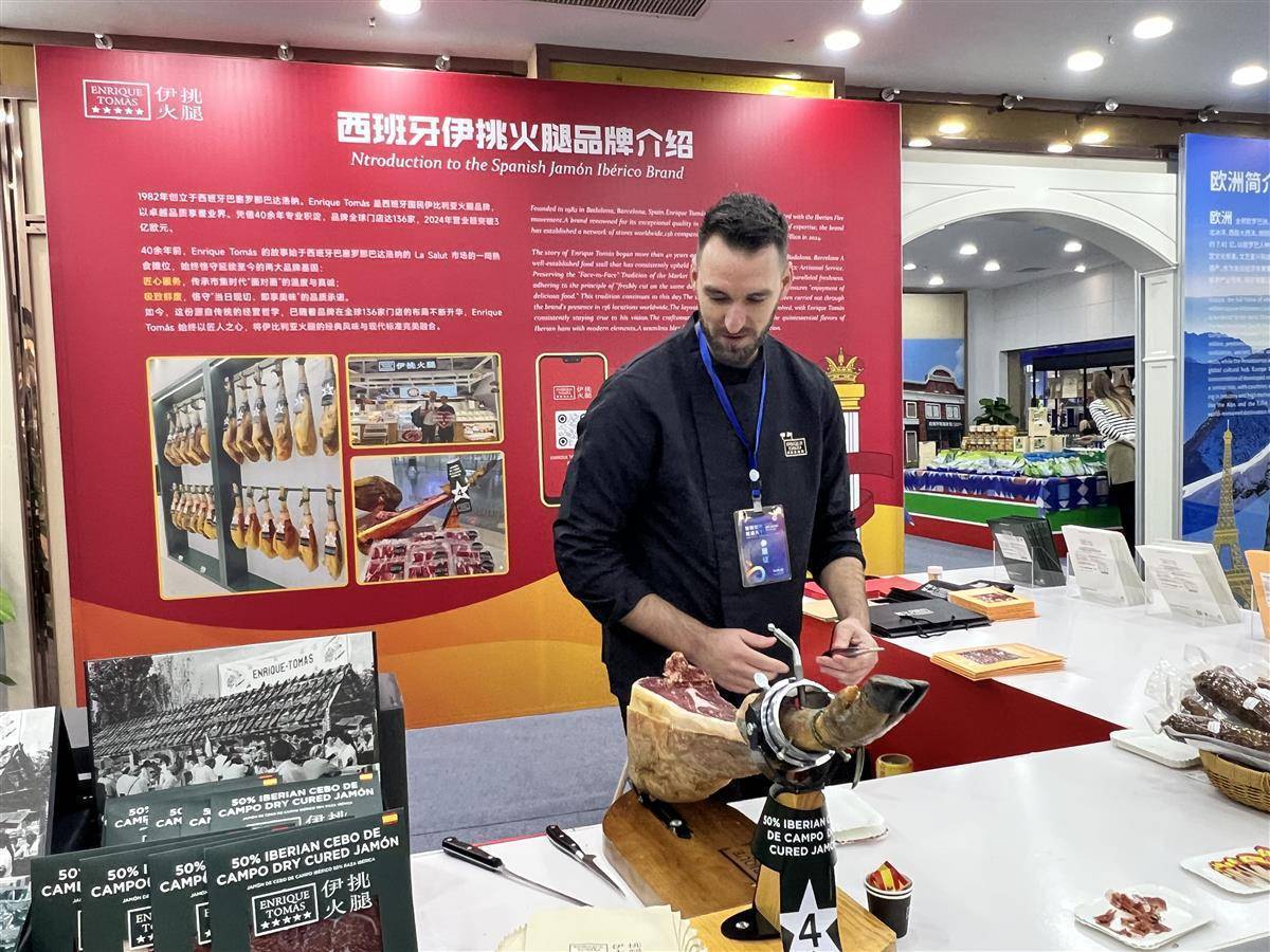 隔壁的欧洲及大洋洲馆内,西班牙进口依挑火腿的展位前客流涌动。“我们在西班牙是家喻户晓的品牌,这次汉交会上备受青睐。”依挑火腿全球门店运营专家拉斐尔・迪亚斯・鲁伊斯(Rafael Diaz Ruiz)介绍,此行希望进一步深耕中国中部及北方市场,让更多中国消费者尝到纯正的西班牙火腿风味。